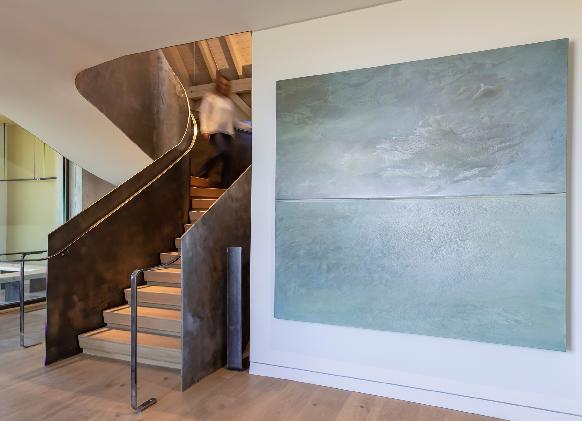 The retreat boasts a mass timber structure, intricately sandblasted and stained in a white-washed palette. The architectural narrative unfolds through cathedral ceilings, extending the roofline to create an expansive space that captures the essence of the three pivotal moments – arrival, internal perspectives, and sweeping views through expansive glass windows onto the serene lake.