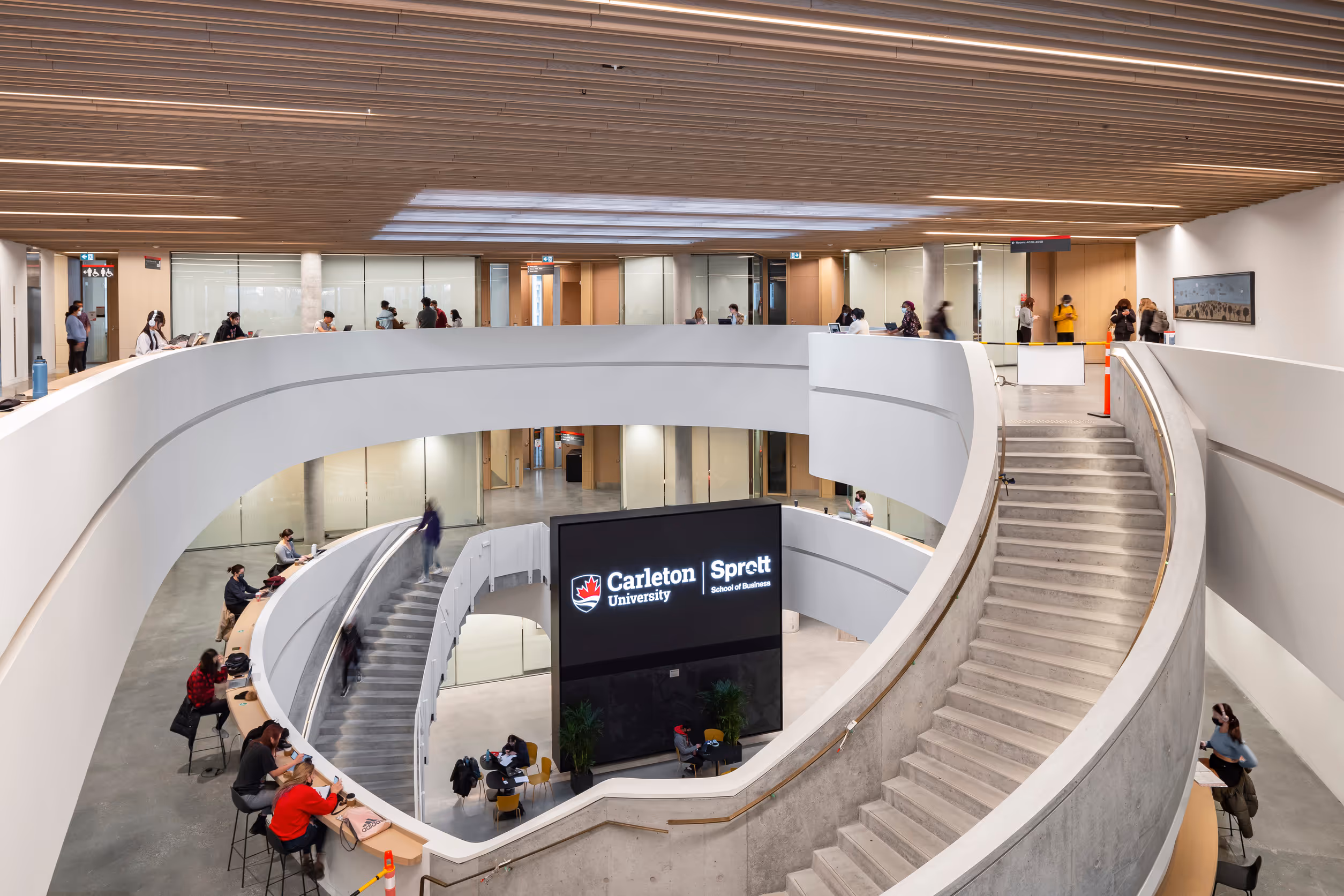 The design for the Sprott School of Business embodies the school’s vision to be known as an innovative, creative, and socially responsible institution. The site will act as a natural focal point of the university as it rests at the convergence of three branches of the school’s tunnel system and sits adjacent to Campus Avenue. Not only will this site become the new heart of the Sprott School of Business and attract the very best students and faculty, but it will also serve as an active hub for the greater Carleton community.
