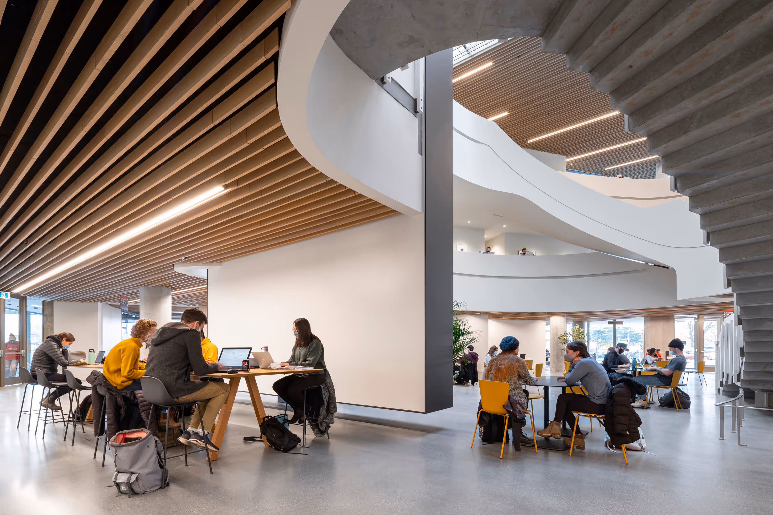 The core of the building, the Forum, is designed to encourage collaboration and facilitate interactive learning. The Forum radiates out to reveal the world-class Research Centre, Resource Centre, and Business Incubator. The ground floor opens upwards to the second and third levels, which arc around a sky-lit three-storey atrium—firmly engaging the community of classrooms and the large lecture theatre on those levels. The curved design will contrast with the rectangular geometry of the existing buildings, featuring a gentle arc encircling the contents within. Locating the faculty offices around the perimeter of the curve allows for windows in every office and expansive views of the surrounding landscape and campus.