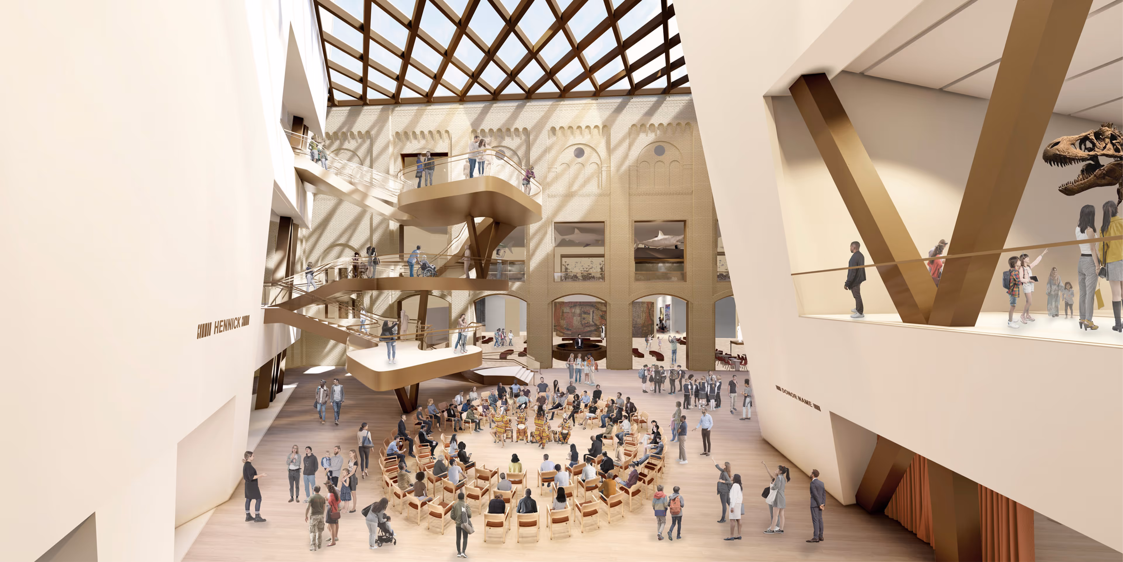 Turning the museum inside out, the design will bring daylight and views deep into the museum to create stronger connections between the public realm, lobby, and galleries. A fully accessible entrance anchors the exterior, sheltered by a cantilevered canopy. A new water feature will wrap the heritage façade, changing from burbling water in the summer to cracked ice in the winter—a nod to Canadian landscapes and the importance of sustainability. Inside, the foyer leads to the new heart of the museum and flexible program space, Hennick Commons, which will feature a soaring four-storey atrium with a diagrid glass ceiling. A grand staircase and a series of ramp connectors serve as the architectural centrepiece, offering whimsical yet straightforward wayfinding and accessible platforms overlooking the commons to knit together old and new.